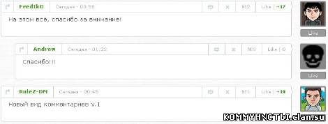 Здравствуйте дорогие читатели, сегодня хочу вас порадовать новым видом комментариев и модер-панель для uCoz, в этом виде комментария присутствует уголок что делает вид комментариев симпатичней, не стандартная модер-панель + кнопка "Ответить", небольшая кнопочка "Like".